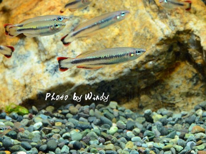 2. **红尾彩虹鱼(Bedotia madagascariensis)**:这种鱼体型较小,身体呈银灰色,最显著的特征是其红色的尾鳍,非常吸引人。