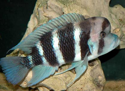 阿尔法六间鱼的身体上有白色的斑点或条纹,背景色为深棕色或黑色。这种鱼体型适中,适合大型水族箱。